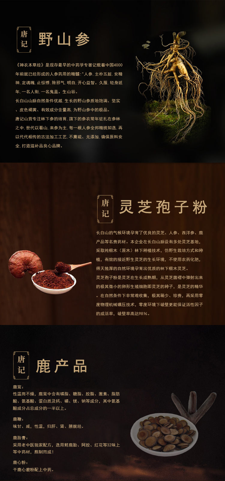 我司主要產(chǎn)品有野山參、林下山參、西洋參、紅參、高麗參、鹿產(chǎn)品、野生靈芝、靈芝孢子粉、野生蜂蜜、野生藥材、山珍以及其他精制天然產(chǎn)品。